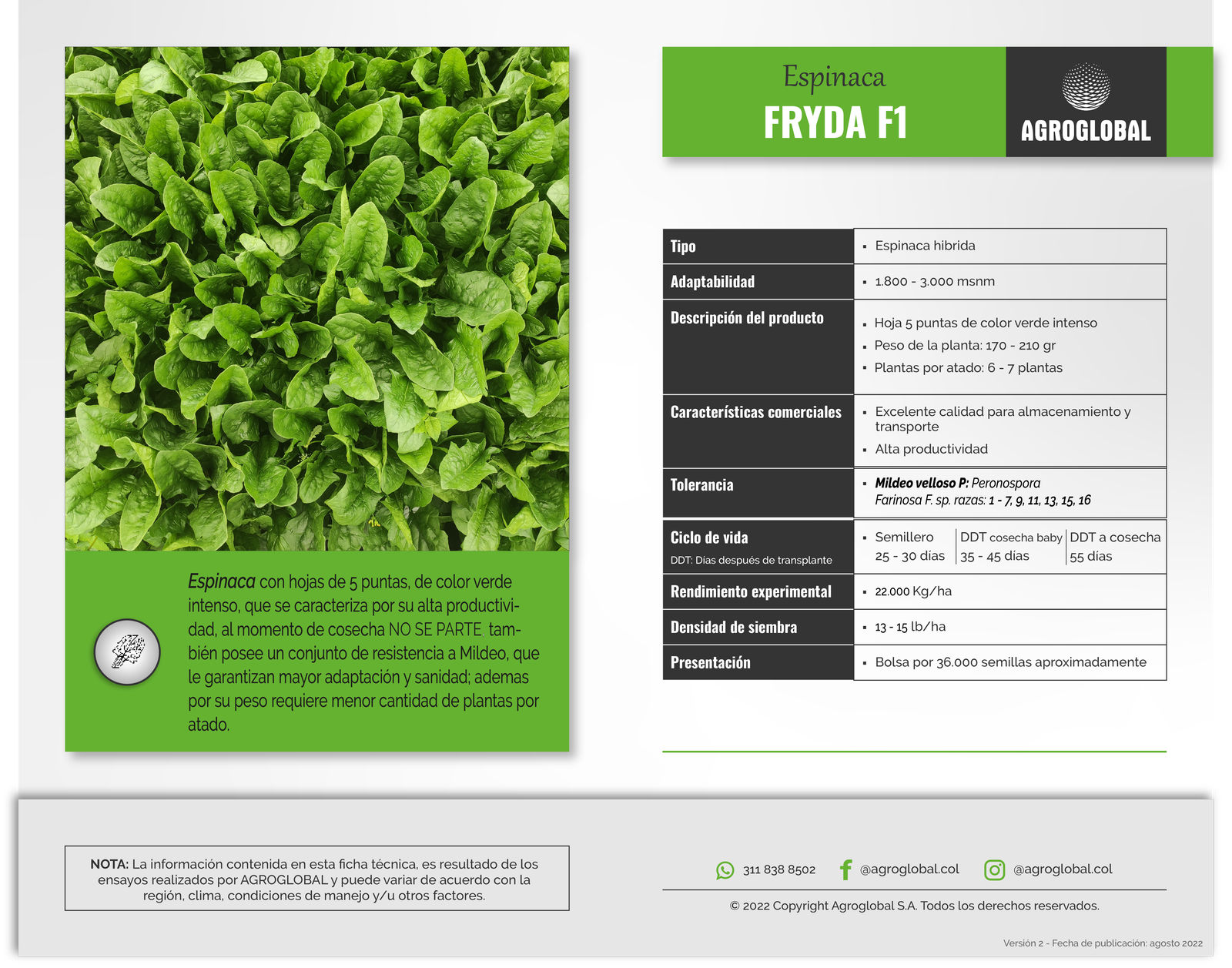 Es una espinaca con hojas de 5 puntas, de color verde intenso, que se caracteriza por su alta productividad, en campo NO SE CRISTALIZA, también posee un conjunto completo de seis resistencias a enfermedades, que le garantizan una mayor adaptación, producción y por su peso requiere menos cantidad de tallos por atado. Bolsa x 500 gr.